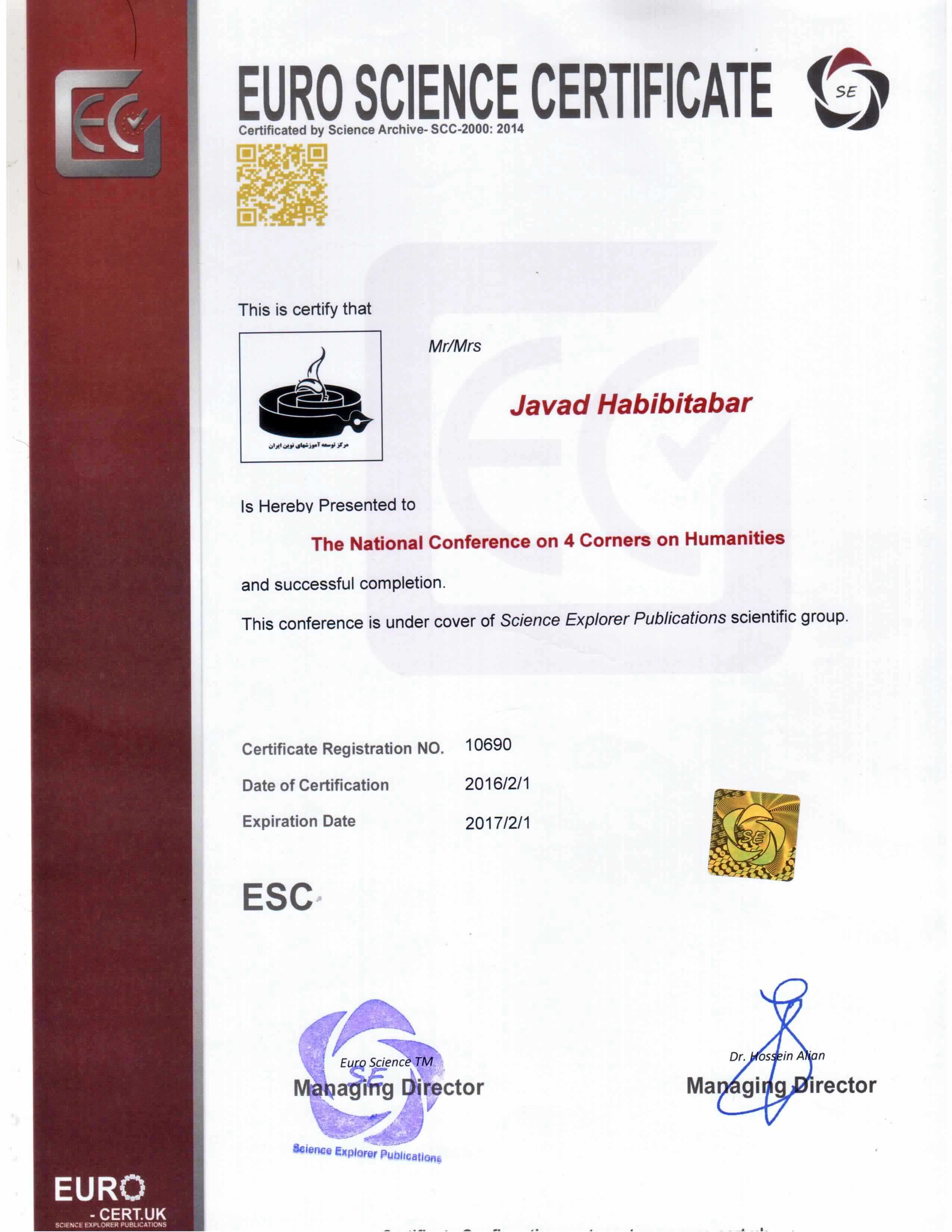 EURO SCIENCE CERTIFICATE - 2014 -javad Habibitabar