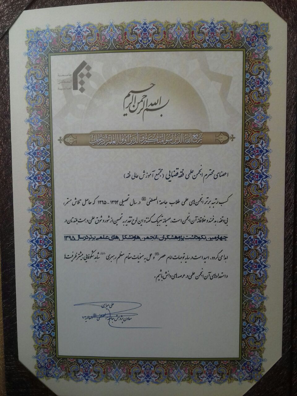 کسب رتبه برتر انجمن های علمی طلاب جامعه المصطفی در سال تحصیلی 1394 - 1395